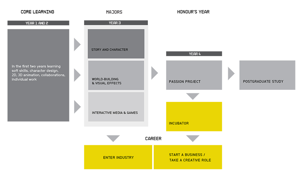 ACG动漫学院的动漫本科学位课程是一个三年制的,并有机会继续深造一年获得本科荣誉学位的课程。该本科学位课程将授予学生作为三个不同专业领域的专家进入动漫行业的一切需求: