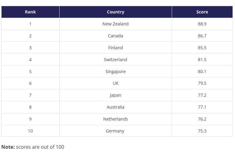 根据这一标准,排名前5名的是新西兰,加拿大,芬兰,瑞士和新加坡。英国是第六位,美国是第12位。