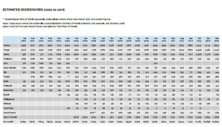 在这些“逾期滞留者”中,来自于汤加(2432人)的最多,其次是萨摩亚(1853人)、中国(1299人)、印度(912人)以及英国(471人)。