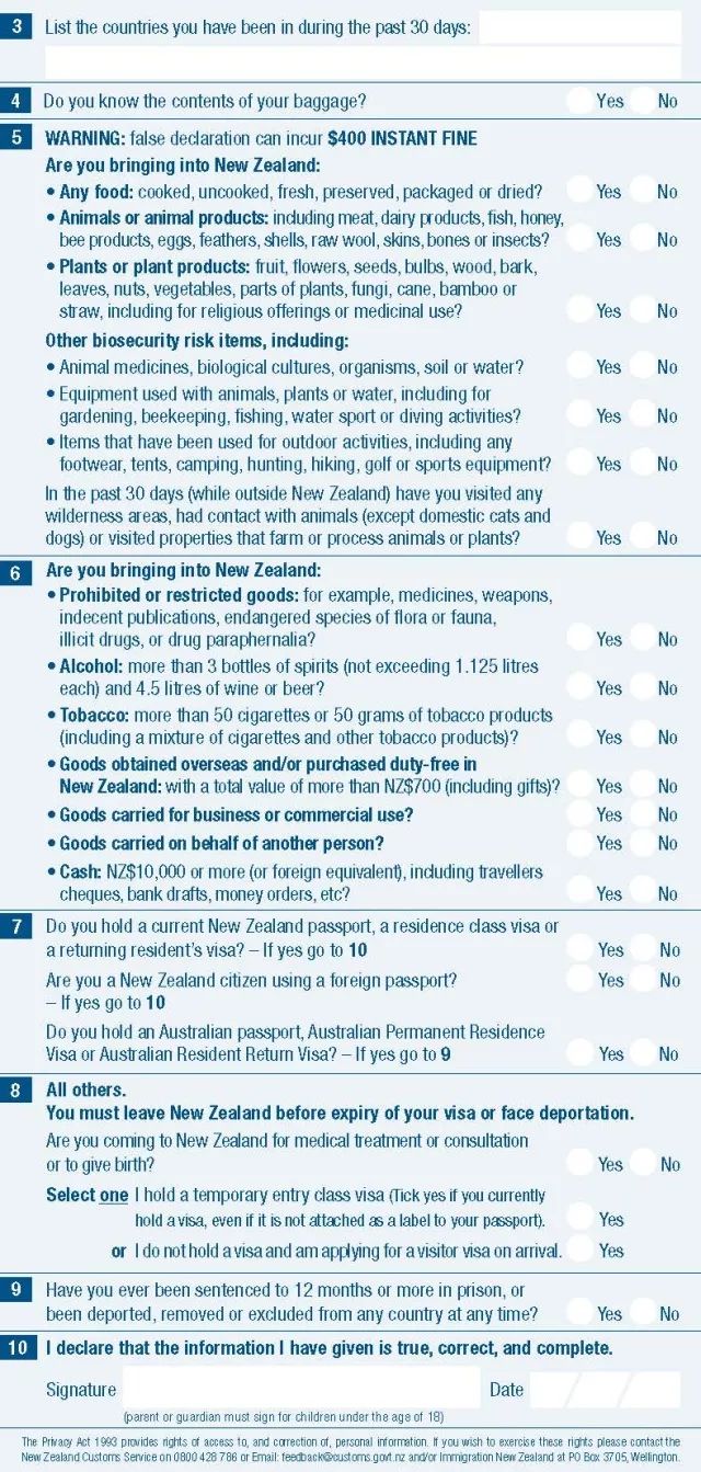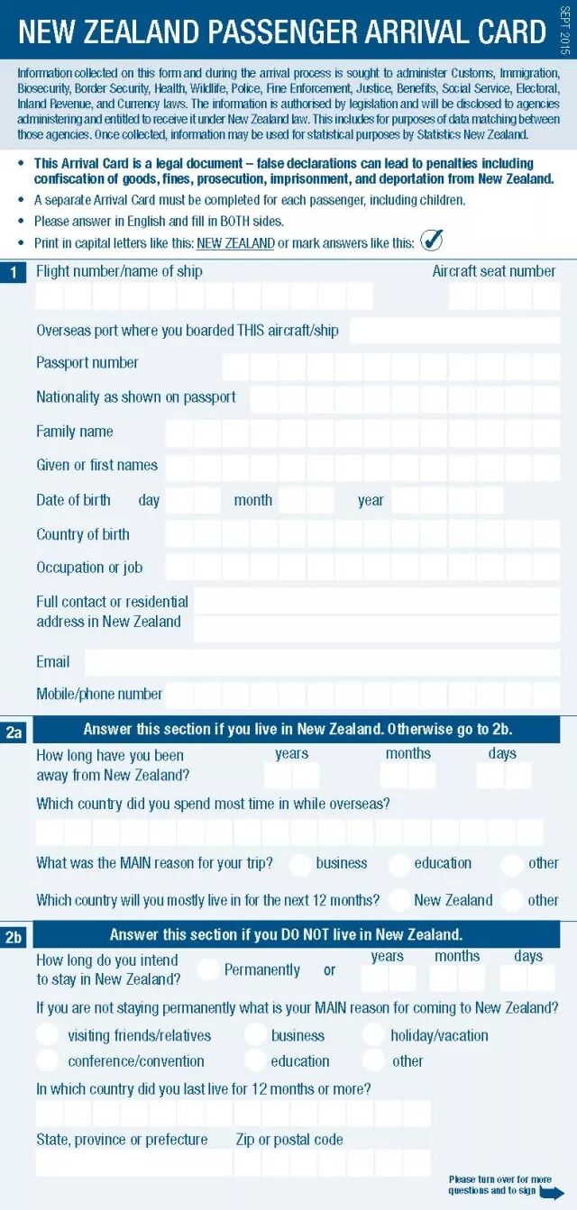 在抵达新西兰之前,你必须填写新西兰乘客入境卡。 这是一份非常重要的文件,你填写的信息必须真实且需要用英文填写。