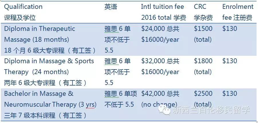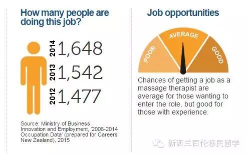 薪酬方面,推拿理疗师一般按照工作时间、客户数量计算,年薪因客户数量不同而有较大差别。根据2013年新西兰人口普查数据,60%的推拿理疗从业者为兼职,并且70%为自雇经营。推拿理疗师年收入在1.3万纽币至3.4万纽币之间,中位数为2.3万纽币。相对较低的行业收入水平为留学生的技术移民之路提供了便利——无论是就读门槛还是就业门槛相对其他“高、大、上”的专业都低了不少——这也是移民大专之所以成为“短、平、快”专业的原因之一。