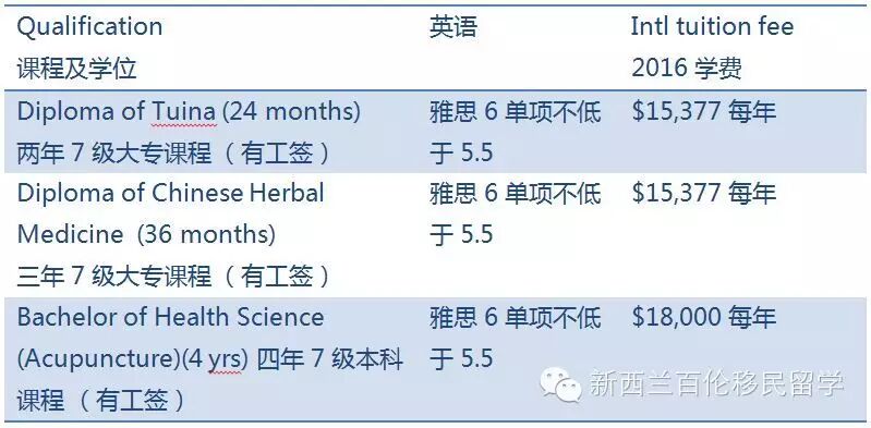 新西兰针灸中医药学院拥有奥克兰和惠灵顿两所分校,其课程涵盖了针灸、推拿、中草药、气功、产科学、传统毛利草药学等领域,为新西兰唯一一所可以提供健康科学专业(针灸方向)4年制本科的院校。