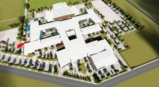新校园的空中俯瞰效果图,主楼面向Travis路。赦理男子中学坐西,雅芳赛德女子中学坐东。